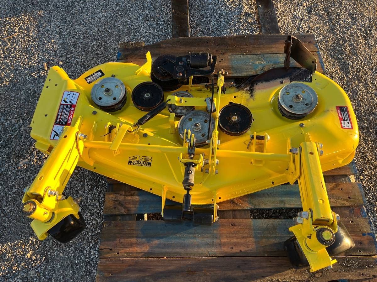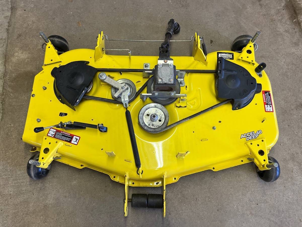 Pictures #10-11 $900 for a 48" Accel Deep deck for John Deere X710, X730, X734, X738, X739, X750, X754 and X758. This will also fit X700, X720, X724, X728, X729, X740, X744, X748 and X749 if you change the rear deck lift arm on your tractor. Deck has removable mulch control kit on it (D9) (A6)